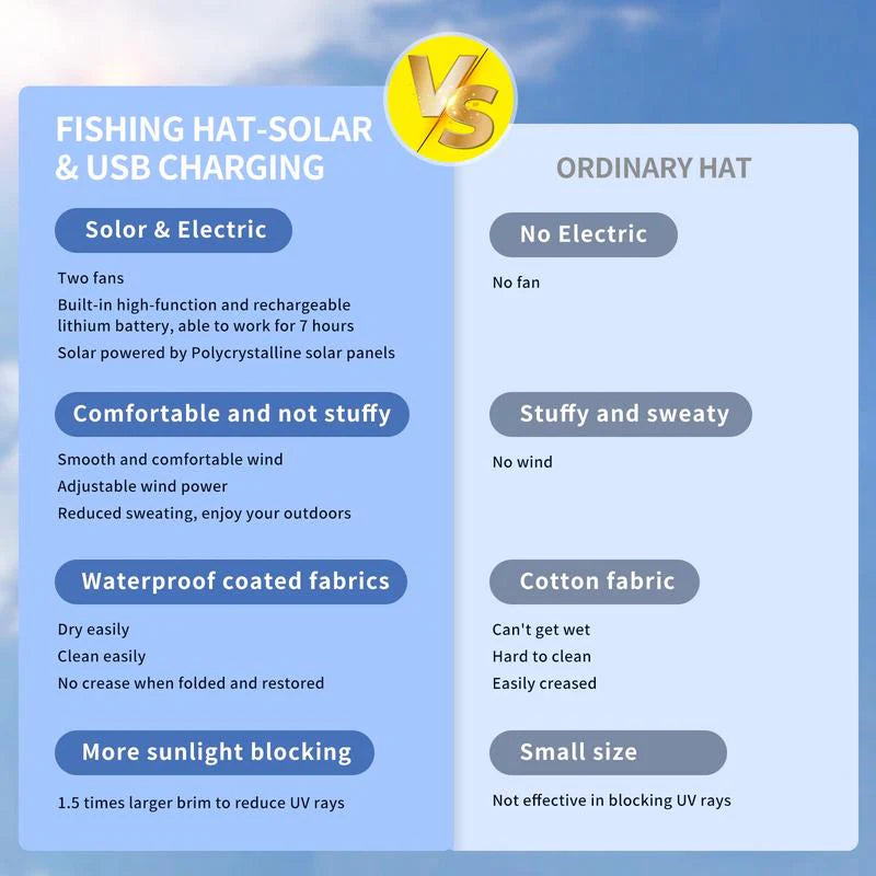 Our hat combines sun protection with cooling airflow, offering dual charging options for continuous comfort, unlike others.